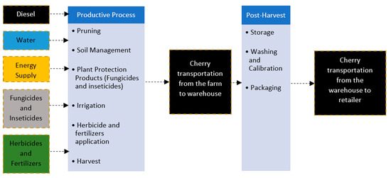 The cherry LCA boundaries are “from farm to market,” and the limits are divided into two phases: cultivation/production period and harvest and post-harvest period. The cut-off criteria for these phases were to define and select the most relevant operations for the study taking into account environmental aspects in terms of energy, water, soil and air impact that can be simultaneously measured quantitatively and in a rigorous and objective way.