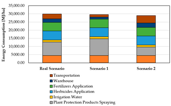 The energy consumption led to the conclusion that, for the production phase, the energy consumption per hectare is the same regardless of the production, except for the spraying of plant protection products operation. The global energy consumption is 29,956 MJ/ha for the real scenario. Comparing these results, there are no significant variations in the global energy consumption between the real scenario, scenario 1 (29,566 MJ/ha) and scenario 2 (28,974 MJ/ha).