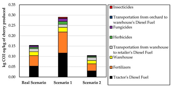 The global warming indicator is 0.1536 kg CO2 eq/kg of produced cherry, showing the tractor’s diesel fuel (34.4%) and the fertilizers (33.1%) as the main hotspots. Comparing these results, scenario 1 reveals a considerable increase (0.2901 kg CO2 eq/kg of produced cherry), and scenario 2 shows exactly the opposite, that is, a considerable decrease (0.1046 kg of CO2 eq/kg of produced cherry). In addition, the use of other plant protection products, fertilizers and herbicides with less environmental impact or reducing the number of the spraying of these compounds could also be a solution to reduce the environmental impact.