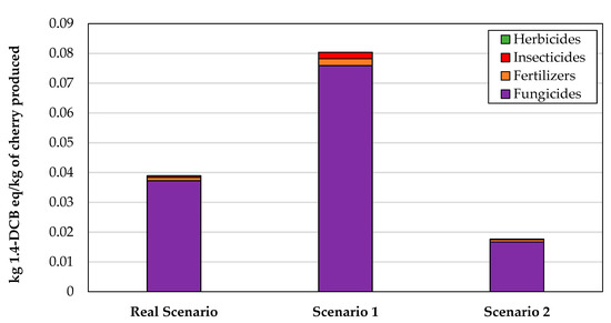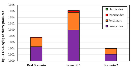Analyzing the comparative results for the different operations for scenarios 1 and 2 shown in Figure 7, there is a large increase (more than double) of the terrestrial ecotoxicity impact comparing the real scenario (3894.26 × 10−5 kg 1.4-DCB eq/kg of produced cherry) with scenario 1, which presents an emission of 8037.72 × 10−5 kg 1.4-DCB eq/kg of produced cherry. There is also a considerable decrease (more than half) comparing the real scenario with scenario 2 (1766.08 × 10−5 kg 1.4-DCB eq/kg of produced cherry). These variations are normal, considering that in scenario 1, there is an increase in the number of sprayings of plant protection products (fungicides and insecticides), causing an increase in the impact of these products. That same impact decreases in scenario 2 because of the number of those sprayings decreases.
