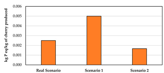 The water impact assessment was evaluated by the indicators of freshwater ecotoxicity and freshwater eutrophication. The freshwater ecotoxicity indicator is 755.41 × 10−5 kg 1.4-DCBeq/kg of produced cherry. The main contributors to freshwater ecotoxicity are the fungicides with 60.7% of the total impact and the fertilizers with 37.2%. For this indicator, scenario 1 shows a substantial increase compared to the real scenario (1620.73 × 10−5 kg 1.4-DCBeq/kg of produced cherry), and scenario 2 shows a considerable decrease (405.82 × 10−5 kg 1.4-DCBeq/kg of produced cherry). The freshwater eutrophication indicator is 0.0025 kg Peq/kg of produced cherry. The freshwater eutrophication impact is caused by the use of phosphorus fertilizers. Comparing with the real scenario, the impact increases to 0.0050 kg Peq/kg of produced cherry in scenario 1 due to the increase in the amount of phosphorus applied into the soil and, in the opposite direction, it decreases in scenario 2 to 0.0017 kg Peq/kg of produced cherry because that same amount of phosphorus applied in the soil also decreases. The replacement of phosphorus-based fertilizers with another chemical element cannot be a solution to reduce this environmental impact since phosphorus is one of the macronutrients that has a very important role in plant growth and development; therefore, it is not possible to make the replacement by another chemical element. However, phosphorus release could be controlled in a more efficient manner in order to limit phosphorus losses, and, in turn, use less fertilizer [53,54].