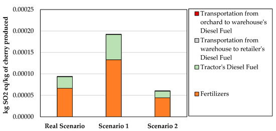 The soil impact assessment was evaluated by the indicators of terrestrial acidification and terrestrial ecotoxicity. The terrestrial acidification indicator is 942.27 × 10−7 kg SO2 eq/kg of produced cherry. The main contributors to terrestrial acidification are the fertilizers (70.5%) and the tractor’s diesel fuel (28.3%). For this indicator, scenario 1 shows a considerable increase compared to the real scenario (1926.64 × 10−7 kg SO2 eq/kg of produced cherry) and scenario 2 also shows a substantial decrease to 605.26 × 10−7 kg SO2 eq/kg of produced cherry). The terrestrial ecotoxicity is 3894.26 × 10−5 kg 1.4-DCBeq/kg of produced cherry. The main contributors to this impact are fungicides (95.7%). Comparing with the real scenario, the impact increases to 8037.72 × 10−5 kg 1.4-DCBeq/kg of produced cherry in scenario 1, and it decreases to 1766.08 × 10−5 kg 1.4-DCBeq/kg of produced cherry in scenario 2. The use of electric vehicles could mitigate this impact, along with the optimization of the cherry’s quantity transported in each trip. In addition, the use of other plant protection products, fertilizers and herbicides with less environmental impact or reducing the number of sprayings of these compounds could also be a solution to reduce the environmental impact.
