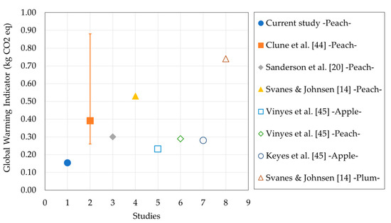 Figure 8 shows the comparative values of the global warming indicator for the studies mentioned above.