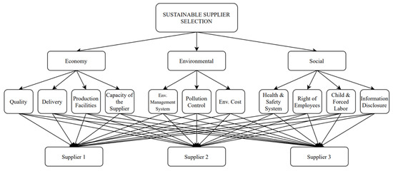 Sustainable supplier selection is a process to identify and evaluate suitable suppliers and their upstream supply chain regarding the three dimensions of sustainability. There are two essential issues in sustainable supplier selection. First is the criteria and sub-criteria for performance evaluation, and second is the approach or method for selecting the best supplier [27]. Mahmood et al. [28] investigated 143 peer-reviewed publications on sustainable supplier selection from 1997 to 2014. They obtained the top 10 criteria for three-dimension on sustainability as follows: (1) Economic criteria: Quality, price, flexibility, cost, logistics costs, lead time, relationship, technical capability, reverse logistics, rejection ratio (ppm).; (2) Environmental criteria: Environmental management system, recycling, controlling ecological impacts, resource consumption, eco-design, energy consumption, wastewater, reuse, air emissions, environmental code of conduct’ (3) Social criteria: Involvement of stakeholders, stakeholder relations, the rights of stakeholders, staff training, health and safety, safety practices, social code of conduct, social management commitment, donations for sustainable projects, and the annual number of accidents [28].