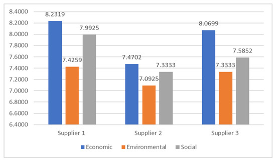 Based on the total value in Table 5, supplier 1 is the most sustainable compared to the other suppliers. Even based on Figure 3, it shows that supplier 1 has excellent performance for all sustainability dimensions. It means that choosing and selecting supplier 1 to be the partner and work-with will increase the company’s sustainability. On the other hand, supplier 3 was on the second rank for sustainable performance. The value for economic, environmental, and social are 8.0699, 7.3333, and 7.5852, respectively.