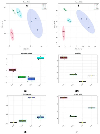 Principal Component Analysis (PCA) score plot of the four tested plant parts. (A) 67 annotated metabolites. (B) Ontology group of 34 annotated metabolites. Total quantitative variances of metabolites or ontology grouped metabolites were clustered to reveal the difference and relative similarities of different plant materials. 95% confidence regions (Hotelling’s T2 eclipse) are displayed for each class. Monoglyceride fraction was particularly present in stem (C), rather than in the other plant parts. By contrast, peptides and diterpenoids were found at higher levels in leaf (D) and root (E), respectively, whereas amino acids were particularly present in the leaf (F).