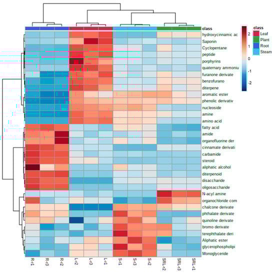 Heat maps showing the qualitative composition and the relative abundance of primary and secondary metabolites in root, stem, leaf and the whole plant. In the heat map columns (data reported in triplicate), red color indicates higher relative levels of metabolites, whereas the blue color suggests a minor content of them. Compound annotation was made comparing the experimental MS/MS spectra to those available in the NIST2020 Tandem Mass Spectral Library. An m/z window of 0.005 Da and a relative intensity threshold of 0.5 were selected as input parameters. Only the compounds with an identification score cut-off > 80% were retained for further analysis. Heatmap was performed with MetoboAnalyst 5.0 for either annotated metabolites or ontology grouped metabolites. Samples were normalized by median, followed by pareto scaling.