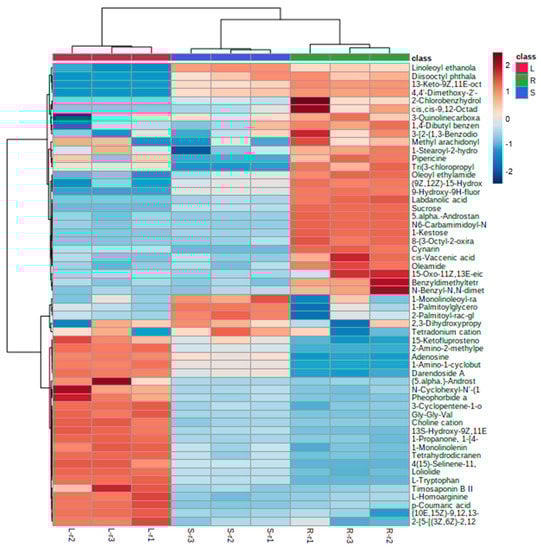 Using normalized peak intensity and principal component analysis (PCA) clustering of all annotated compounds, clear differences were observed in the metabolite profiles of the four plant parts (Figure 1 and Figure 2; Table 1 and Table 2). Although PCA analysis indicated that the different plant materials display similar metabolite profiles, oligosaccharides, disaccharides and fatty acids were found to be much more abundant in root than in the other plant parts. Monoglyceride fraction was particularly present in stem rather than in the other plant parts. By contrast, peptides and diterpenoids were found at higher levels in leaf and root, respectively, whereas amino acids showed very different distribution patterns in the four plant parts. In future experiments, to improve understanding of metabolic pathways and considering the complexity of compounds measured and their various physical and chemical properties, an internal standard for each ontology group could be used to address the differences between the extraction and ionization processes.