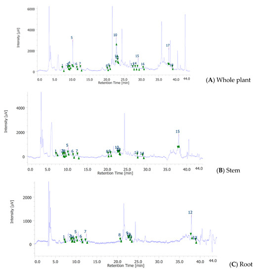 Plants are an important source of pharmacologically active secondary compounds, that can be used in medicine to maintain and improve human health and also to treat specific conditions or illnesses [1,2]. Among these compounds, phenolics are very common and easy to find in plants, and they have demonstrated beneficial advantages in terms of antioxidant and antimicrobial activities. In particular, antioxidant metabolites can be used against different oxidative stress-induced diseases [3], while the antimicrobial properties of such compounds can rehabilitate the clinical application of older antibiotics by improving their efficacy and, therefore, by preventing the development of resistance [4]. Bidens pilosa L. (fam. Asteraceae) is an annual herb native to South America that is spread worldwide, especially in tropical and subtropical regions [5]. B. pilosa L. is used globally in phytotherapy and each plant material or the whole plant have been declared to be effective in treating many illnesses such as malaria, flu, cancers, headache, inflammation, wounds, angina, metabolic syndrome, immunological disorders, and digestive and infectious diseases [6]. The plant has been widely used in Taiwan as a traditional medicine and as a major ingredient of herbal tea, which is believed to prevent inflammation and cancer [7]. Phytochemical and pharmacological analyses of B. pilosa employing roots [8], leaves [9], or the whole aerial parts [10,11] have also been published. In this regard, the studies indicated the presence of phenolic compounds that could explain, albeit partially, antioxidant and antimicrobial activities [12,13,14,15,16,17,18,19,20]. In a study by Abajo et al. (2004) [15], the antioxidant activity of an aqueous infusion of B. pilosa has been investigated by studying its protective effect on the hemolysis induced by an initiator of radicals such as 2,2′-azobis(2-amidinopropane) dihydrochloride (AAPH). The amount of B. pilosa infusion that halved the hemolysis induced by AAPH was 6 µL (IC50: 1.19 mg mL−1 dry weight). Chiang and colleagues (2004) [21] evaluated the free radical scavenging activity of the crude extract, and fractions of B. pilosa using 1,1-diphenyl-2-picrylhydrazyl (DPPH) and hypoxanthine/xanthine oxidase assays. They found that the B. pilosa crude extract and the ethyl acetate, butanol, and water fractions had free radical scavenging activity and that the ethyl acetate and butanol fractions were more active than the water fraction and crude extract [21]. A complementary study by Muchuweti et al. (2007) [22] determined antioxidant activity of B. pilosa methanol extract. It also showed 1,1-diphenyl-2-picrylhydrazyl (DPPH) radical scavenging activity [22]. Ashafa et al. (2009) [18] reported that the methanol and acetone extract of B. pilosa roots displayed antibacterial activities against Bacillus cereus, Escherichia coli, Klebsilla pneumonia, Micrococcus kristinae, Pseudomonas aeruginosa, Staphylococcus aureus, S. epidermidis, Serratia marcescens, Shigelea flexneri, and Streptococcus faecalis. Deba et al. (2007) [23] first evaluated the antifungal effect of the hot water extracts of the B. pilosa roots, stems, and leaves against Corticium rolfsii, Fusarium solani, and Fusarium oxysporum. C. rolfsii was particularly sensitive to the treatment with B. pilosa as its growth was reduced at almost all the tested concentrations, followed by F. oxysporum and F. solani. However, the fungicidal activities of the stems and roots were greater than the leaves [23]. The composition analysis of the extracts revealed the presence of different phenolic compounds that could be at the basis of the fungicidal effects. Essential oils appeared to have better fungicidal activity than water extracts [17]. Acetone, methanol, and water extracts of the B. pilosa roots also showed antifungal activities against Aspergillus niger, A. flavus, and Penicillium notatum using the agar dilution method [18]. The methanol extract of the B. pilosa roots at 10 mg/mL was also effective against Candida albicans [18]. Shandukani et al. (2018) [20] investigated the B. pilosa antibacterial activity against waterborne diarrhoeagenic bacteria. All the bacterial species tested were sensitive to the effect of different extracts of B. pilosa. Moreover, Nthulane et al. (2020) [24] determined the antimicrobial activities of plant extracts against the bacteria causing common sexually transmitted infections. The results showed that dichloromethane extract of B. pilosa exhibited good activities against Neisseria gonorrhoeae and Gardnerella vaginalis, whereas ethyl acetate, dichloromethane and methanol extracts of B. pilosa exhibited good activities against C. albicans. Some classes of compounds such as flavonoids, aliphatics, terpenoids, phenylpropanoids, aromatics and porphyrins were isolated from B. pilosa and related to the bio-pharmacological properties of this plant [5,19]. Also, saponins and steroids were identified in the phytocomplex of B. pilosa. These compounds were suggested to be involved in the antioxidant [21], antibacterial and antimicrobial activities [5,20]. In recent years, metabolomics, which is defined as the monitoring of metabolite concentration in a cell, tissue, organ or in the whole plant, has become prominent as a part of systems biology. Nonetheless, differentiation between different plant materials of B. pilosa based on their metabolomic profiling has not been carried out yet. For a suitable comparative antioxidant and antimicrobial activity of different plant materials of this precious plant, we proposed the in vitro antimicrobial activity study of the roots, leaves, stems and the whole plant extracts of B. pilosa by using various solvents. This study evaluates such activity towards some selected Gram-positive, Gram-negative bacteria and fungal species. Furthermore, a mass spectrometry ultra-performance liquid chromatography mass spectrometry (UHPLC)–QTOF method, coupled with different multiva