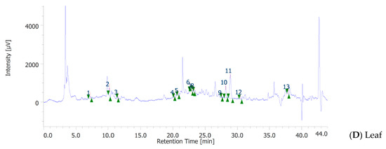HPLC–DAD-MS analysis of methanolic extracts from B. pilosa plant materials. Among identified phenolic compounds in Table 1, caftaric acid (peak #3), catechin (peak #4), chlorogenic acid (peak #5) and epicatechin (peak #6) were identified in the whole plant (A), stem (B) and root (C). In the leaf (D), the principal phenolics identified in the extract were: gallic acid (peak #1), chlorogenic acid (peak #2) and epicatechin (peak #3).
