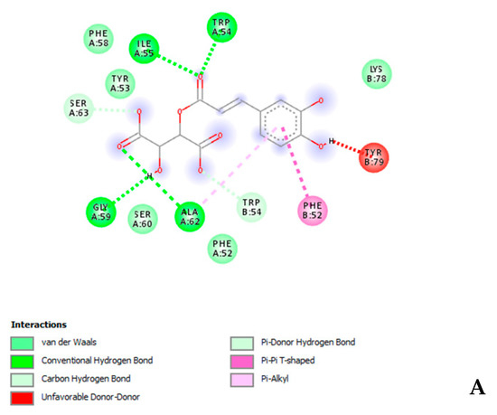 The results of the in silico experiment highlight the capability of caftaric acid to interact with the active site of the enzyme with a micromolar affinity, through the formation of both hydrogen bonds and alkyl interactions (Figure 4). The affinity of the caftaric acid was compared to that of the reference drug ketoconazole that, as expected, shows a much higher (sub-micromolar) affinity compared to that of caftaric acid.
