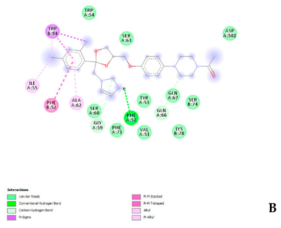 Docking calculations were conducted through the Autodock Vina of PyRx 0.8 software, as recently described [31]. Crystal structures of target protein were derived from the Protein Data Bank (PDB) with PDB ID as follows: 5TZ1 (lanosterol 14α-demethylase). Discovery studio 2020 visualizer was employed to investigate the protein–ligand nonbonding interactions.