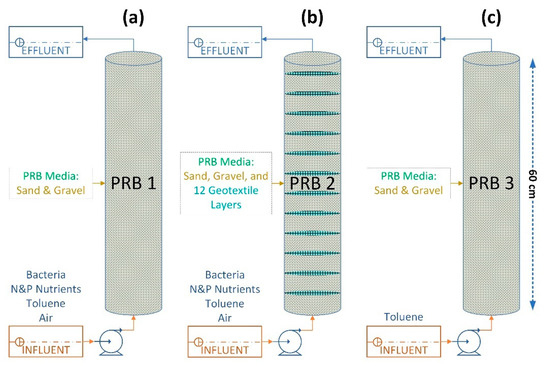Three PRBs (60 cm height and 10 cm diameter) were filled with gravel and coarse-to-medium-sized sand. Each PRB column consisted of an influent tank and an effluent tank, as depicted in Figure 1. The PRB columns were operated as up flow reactors. Reactor 1 (PRB-1) and reactor 2 (PRB-2) were inoculated with specific bacteria (Alcanivorax) and required nutrients (ammonium chloride as N source and potassium dihydrogen phosphate as P source) were added. To maintain aerobic conditions, influent tank for PRB-1 and PRB-2 were aerated when the dissolved oxygen levels fell below 3 mg/L. PRB-2 also included 12 layers of nonwoven geotextile fabrics placed horizontally at 5 cm intervals. Reactor 3 (PRB-3) was used as control and contained only sand and gravel mixture without bacteria and nutrient addition. Additionally, aeration was not performed for PRB-3 since it was used as control reactor. Simulated PRB columns were designed and constructed for the remediation of toluene by; bioaugmentation and biostimulation (PRB-1), bioaugmentation and biostimulation by using the potential biomass holding capacity of nonwoven geotextile fabrics (PRB-2), and natural attenuation (PRB-3) (Table 2). PRB columns were made of transparent acrylic glass.