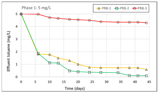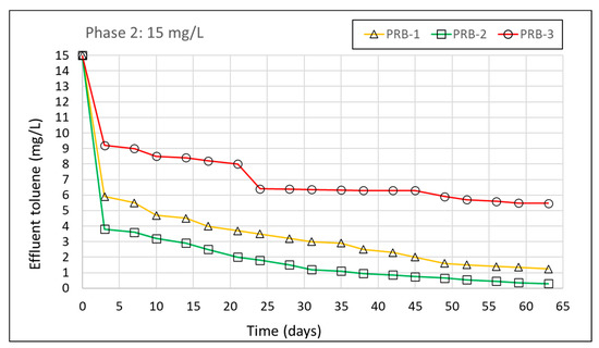 Figure 5 shows the toluene removal rates in PRB-2 for phase 1, phase 2, and phase 3 combined. Regardless of the influent concentration, final toluene removal rates in PRB-2 for phase 1, phase 2, and phase 3 were always greater than 97%. Additionally, the final toluene concentrations in PRB-2 were always less than the threshold value of 0.7 mg/L set by WHO.