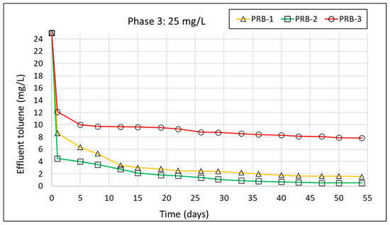 Consecutive toluene bioremediation studies were performed for influent concentrations of 5 mg/L (phase 1), 15 mg/L (phase 2) and 25 mg/L (phase 3) for the PRB columns.