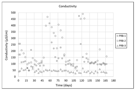 In this study, conductivity, pH, and dissolved oxygen values in the PRB effluents were monitored twice a week. Conductivity readings for the three PRB columns were presented in Figure 6. Conductivity reading values were recorded between 26 and 81.9 µS/cm for PRB-3, which indicated steadiness compared to PRB-1 and PRB-2. However, PRB-1 and PRB-2 showed higher conductivity readings due to the addition of weekly nutrients and monthly microbial inoculum. Conductivity values in the effluents of PRB-1 and PRB-2 varied between 46.9 and 500 µS/cm, which indicated more fluctuations in the conductivity values compared to PRB-3. It can be seen in Figure 7 that the effluent pH values for the three PRBs started at near-neutral, then for PRB-1 and PRB-2 it remained between 6.1 and 8.3, whereas for PRB-3 the range was between 7.4 and 9.29. The DO values were maintained always greater than 3 mg/L by intermittent aeration of the influent tanks of PRB-1 and PRB-2 (Figure 8).