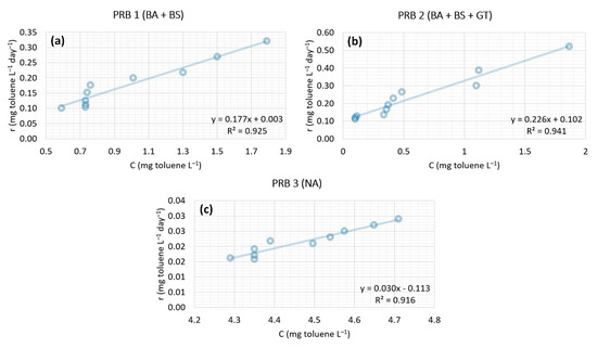 Reaction rate data for the PRB toluene treatment processes for phase 1: (a) The first-order model for PRB-1, (b) the first-order model for PRB-2, and (c) the first-order model for PRB-3.