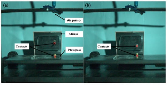 The procedure of measuring the coefficient of restitution between maize seed particles and boundaries is as follows. First, the position of the support frame was adjusted so that the air pump nozzle was directly above the organic glass plate, and the angle of the mirror was adjusted so that the organic glass plate could be seen completely through the computer screen. After the air pump generates suction, the seed is adsorbed on the nozzle, as shown in Figure 1a. Second, when the air pump is turned off, the seed falls vertically under gravity and collides with the organic glass plate, which is recorded by a high-speed camera (YORK TECH, Rock Hill, SC, USA). Playing back the video, contact point 1 with the aid of the mirror is marked when the seed contacts the organic glass plate for the first time, as shown in Figure 1a, and similarly, contact point 2 is marked when the seed contacts the organic glass plate for the second time, as shown in Figure 1b. Finally, the offset distance between contact point 1 and contact point 2 is compared. If the offset distance is small, namely, there is a vertical collision, and no obvious rotation occurs after the seed collides with the organic glass plate, the test data will be retained; otherwise, they will be eliminated until the number of tests meeting the requirements reaches 10.