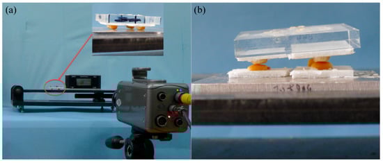 The procedure of measuring the coefficient of static friction between particles and boundaries (organic glass) is as follows. First, three randomly selected maize seed particles were glued on an 80 mm × 80 mm × 10 mm organic glass plate, and the organic glass plate adhered to maize seed particles was placed on an organic glass plate installed on the device (see Figure 3a). The inclinometer is located horizontally at the device. Second, the slope is slowly lifted until the organic glass plate adhering to the maize seed particles slid down the slope. Finally, the indicator of the inclinometer is obtained when the maize seed particles just slide on the inclined plane by the high-speed camera (YORK TECH, Rock Hill, SC, USA). The experiment is repeated five times in each group. The coefficient of static friction between the seed particles and the wall is calculated by the following formula :