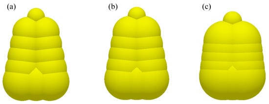 Particle models of the horse-tooth-shaped seed of three varieties: (a) Liangyu99, (b) Xianyu 335, and (c) Zhengda 999.