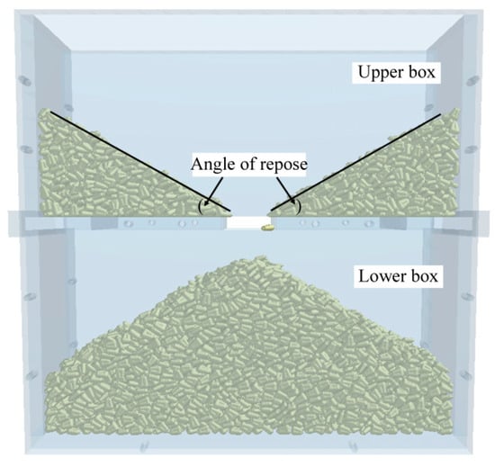The process of the draw-down test is as follows. When the simulation begins, first, a cuboid area of 320 mm × 64 mm × 25 mm is established to create seed particles (1.5 kg). Then, when the seeds gradually stabilize, the hole in the middle opens, and the particles flow downward. Lastly, when the particles do not move, particles left above the device form two piling angles, as shown in Figure 5. The piling angles are measured by the image processing method. Five repetitions are made for every group.