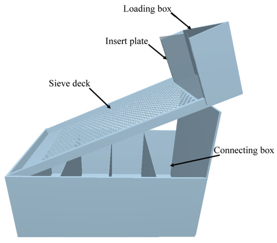 The process of the sieving test is as follows. First, a cuboid area of 60 mm × 100 mm × 280 mm is established in the loading box to create seed particles (0.2 kg), as shown in Figure 6. Then, when the seeds gradually stabilize, the hole in the middle opens, and the particles flow down by gravity. When the movement of particles is finished, the particles stay either in the collecting box beneath the sieve deck or on the screening deck. Lastly, the seed mass falling into each collecting box and the total mass passing through the sieve was quantified. Each simulation is repeated five times.