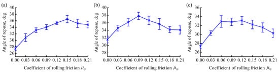 In this section, the sensitivity of the coefficients of rolling friction between seed particles and between seed particles and the boundary to the angle of repose is studied to provide an effective basis for parameter calibration by a single-factor test.