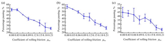 Influence of coefficient of rolling friction between seed particles and boundary on percentage passing for three varieties: (a) Liangyu99, (b) Xianyu 335 and (c) Zhengda 999.