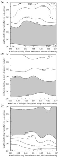 Figure 9a–c shows the effect of coefficients of rolling friction (between seed particles and between seed particles and boundary) of seed particles of three maize varieties on the piling angle. For Liangyu 99, Xianyu 335, and Zhengda 999, the coefficient of rolling friction between seed particles and the boundary has no effect on the piling angle, and the piling angle is highly sensitive to the coefficient of rolling friction between seed particles. Therefore, the coefficient of rolling friction between seed particles can be calibrated by the single-factor test of the piling angle.