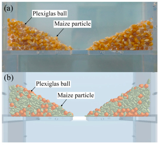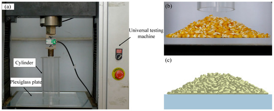 The device of the lifting cylinder test is shown in Figure 14a, and the diameter and height of the cylinder made of organic glass are 80 mm and 200 mm, respectively. In addition, the coefficients of rolling friction between maize seed particles and between the seed particles and the boundary are adopted from the values calibrated in the previous section. Other parameters used in the simulation are shown in Table 1.