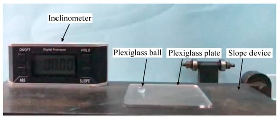 The coefficient of static friction between the boundaries (organic glass) is determined by the slope method, and the coefficient of restitution between boundaries (organic glass) is measured by the dropping test. The coefficient of rolling friction between the boundaries (organic glass) is measured by the slope method, as shown in Figure 11.