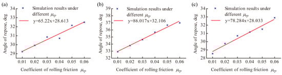 Figure 13a–c shows the relationship between the piling angle and coefficient of rolling friction between seed particles and organic glass spheres for three maize varieties. Taking the calibration of the coefficient of rolling friction between maize seed particles and organic glass spheres of Liangyu 99 as an example, it can be seen from Figure 13a that as the coefficient of rolling friction between seed particles and organic glass spheres increases, the piling angle increases. The linear relationship between seed particles and organic glass spheres is obtained by linear fitting, and the formula of the linear relationship is as follows.