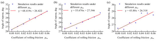 Figure 12a–c shows the relationship between the piling angle and coefficient of rolling friction between seed particles for three maize varieties. Taking the calibration of the coefficient of rolling friction between seed particles of Liangyu 99 as an example, Figure 12a shows that the piling angle increases with the increase in the coefficient of rolling friction between seed particles. The linear relationship between the piling angle and coefficient of rolling friction between seed particles is obtained by linear fitting, and the formula of the linear relationship is as follows.