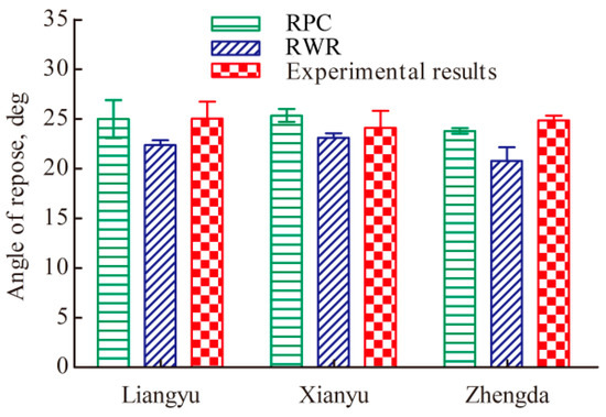 Figure 15 shows the simulation results and the experimental results of the lifting cylinder test. The relative errors between the simulation results using calibrated parameters (RPC) and the experimental results in terms of the piling angle for the three maize varieties are small, which are 0.27%, 5.09%, and 4.29%, respectively. However, the simulation results without considering the rolling friction (RWR) are lower than those with considering rolling friction for the three maize varieties and differ largely from the experimental results. The relative errors between the simulation results without considering the rolling friction (RWR) and the experimental results are 10.75%, 4.15%, and 16.39%, respectively.