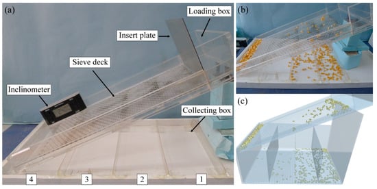 The accuracy of maize seed parameters was further validated by a “self-flow screening” test. In the test, the thickness, length, and width of the sieve deck made of organic glass are 1.5 mm, 580 mm, and 300 mm, respectively, and the collecting box is divided into 4 compartments defined as Section 1, Section 2, Section 3, and Section 4 from right to left (Figure 16a–c). In addition, a round sieve aperture of 9 mm diameter is determined [19]. The inclination angle of the sieve deck is 24°. Additionally, the coefficients of rolling friction between maize seed particles and between the seed particles and the boundary are selected from the values calibrated in the previous section. Other parameters used in the simulation are shown in Table 1.
