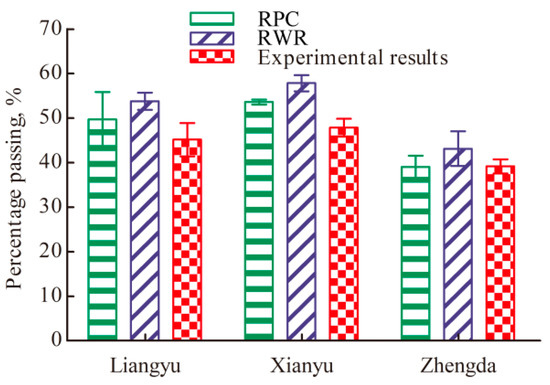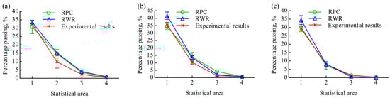 Figure 17 and Figure 18 are the comparison of the simulated results and the experimental results in terms of the total percentages passing and percentage passing of different statistical areas for the three maize varieties. As shown in Figure 17, the differences between the simulation results using calibrated parameters (RPC) and the experimental results in terms of the total percentages passing for the three maize varieties are small, which are 10.01%, 12.05%, and 0.34%, respectively. However, the simulation results without considering the rolling friction (RWR) are significantly greater than the experimental results. Furthermore, Figure 18 shows that the simulation results using calibrated parameters (RPC) are close to the experimental results in terms of the percentage passing of different statistical areas for the three varieties. The simulation results without considering the rolling friction (RWR) differ largely from the experimental results.
