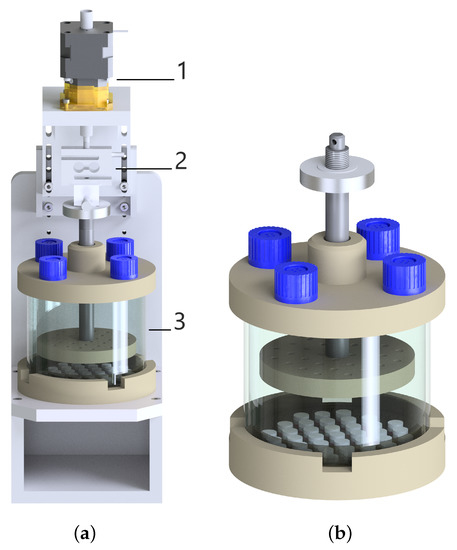 (a) The technical drawing of the compression bioreactor with its components: linear motor (1), load cell (2), and chamber (3). (b) More focus on the chamber with the petri dish including 37 samples and with the stamp.