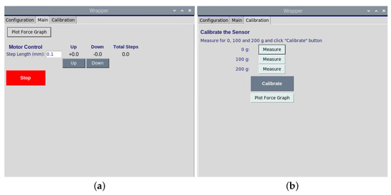 (a). The graphical user interface of motor movement opposite or toward the samples. (b). The graphical user for the calibration of load sensor.