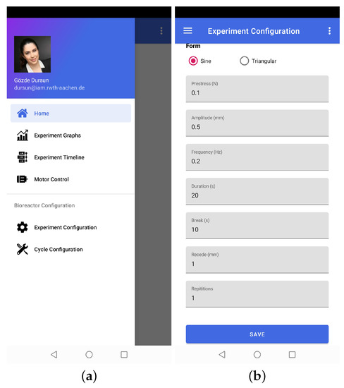The functionalities of the application can be divided into two broad categories, i.e., experiment control and data visualization. The experiment-control-related functionalities include entering experiment parameters, positioning the stepper motor, starting/closing the experiment, viewing experiment graphs, and checking the status of the bioreactor (see Figure 5). Data visualization functionality refers to retrieving historical experiment data from a cloud database and recreating experiment graphs. That is how the application remotely provides full control of the experiments and bioreactor.