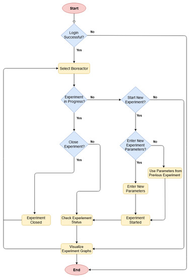Figure 7 represents the workflow of the mobile application. The application starts with a login page, which is followed by the selection of the desired bioreactor. If an experiment is already in progress on the selected bioreactor, then it shows the current status and relevant data graphs. It also allows the user to close the experiment. Otherwise, if no experiment is running, the user can make a choice to either start a new experiment or to visualize data graphs from the previous experiments. If the user proceeds with a new experiment, then he/she needs to either enter new experiment parameters or reuse them from the previous experiment. Once the experiment is conducted, the user can see the data graphs and current status.