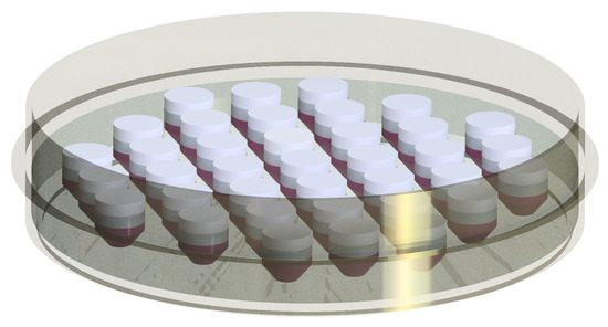Recently, 3D printing techniques have been used for the bioreactor design to fabricate low-cost and customizable systems [23,24]. Here, Here, a silicone mold for the cultivation of the 3D in vitro models was produced with a negative form which was developed using 3D printing technology. This method enables us to design highly customizable silicone molds, and thereby investigate different implants in distinct sizes and shapes. Moreover, the culture well-based structure of the molds allowed for the cultivation of 37 separate in vitro models (see Figure 8) The customizable structure of these silicone molds holds an advantage for the examination of different adjustment of cell concentration and cell types. Further, collagen material is used in this study to create the in vitro model due to our research interest. However, it should be noted that the developed bioreactor system is compatible with different tissue engineering scaffolds such as alginate, chitosan, and elastin. Furthermore, the bioreactor prototypes manufactured using 3D printer enable simplicity in the design of bioreactors, where the bioreactor can be easily assembled and disassembled. This ensures that the contamination risk in the cultivation chamber is minimized since the sampling and maintenance of the in vitro models can be performed in the short term out of incubator.