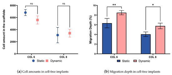 The compression bioreactor system is also very effective in supporting the cell migration process into cell-free collagen-I-based implants. The graph represented in Figure 12a shows the number of cells located on the outer surface of cell-free implants. There are no statistical difference in the cell amounts between COL-6 and COL-8, as well as dynamically and statically cultured in vitro models. In parallel, the migration depth graph represented in Figure 12b indicates that the cell migration depth was higher in the dynamically cultured COL-6 and COL-8 implants than statically cultured samples. This proves that the dynamic culture of in vitro models in the compression bioreactor system promotes active cell migration from the cell-seeded collagen matrix into the different concentrations of cell-free collagen-I-based implants, COL-6 and COL-8. Furthermore, it should be emphasized that the COL-6 implants may possess larger pore sizes inside the material in comparison to the COL-8 implants since the lower collagen fiber concentration of COL-6 implants is lower and thereby water content is higher. This may lead to a faster cell migration inside COL-6 implants, as well as a difference in the structural stiffness of the implants represented in Figure 11b. The higher structural stiffness of COL8 can be explained by its more densely packed collagen fibers due to its higher collagen and lower water concentration. The variation in cell migration between COL-6 and COL-8 implants, statically and dynamically cultured, may correlate with the pore size and structural stiffness of implants since cellular and tissue functions are modulated by the physical properties of the substrate.