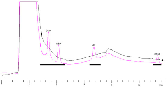 LC chromatograms from an unfortified leachate sample (black) and the leached sample fortified at 1 mg/L of each phthalate (pink). The thick black lines correspond to the LC fractions transferred to the fraction collector.