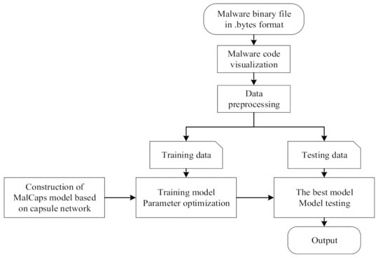 In this section, we describe our capsule network-based approach for malware classification in detail, including the dataset we used for our experiments, malware data preprocessing, capsule neural network architectures, and our proposed capsule network. The overall flow of the proposed methodology is shown in Figure 2.