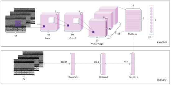 The network architecture of our proposed MalCaps model consists of the convolutional part, the primary capsule part, and the classification part, as Figure 5 shows, and the calculation process is shown in Formula (8). The input of the network is a 64 × 64 × 3 grayscale image, which is converted from malware training samples according to the method in previous description. A down sampling method is used to unify the original image of fixed format as the input of the model. The convolutional part utilizes 2 convolutional layers instead of 1 for feature extraction. The extra convolutional layers can provide more specified feature maps that can be fed into the primary capsule. The first convolutional layer of MalCaps contains 5 kernels of size 3 × 3 with a stride of 1, without padding, using the ReLU function as a nonlinear activation function. Output of the first convolution layer was given to the second convolution layer as input to extract useful low-level features. The second convolutional layer retains the same structure as the first. The next layer is a primary capsule layer, which contains 32 different capsules that systematizes the processed feature maps into capsule nodes. Each capsule node contains 3 × 3 convolutional kernels at a stride of 3, generates 32 distinct 20 × 20 capsules in 8 dimensions and fed into classification capsule. The final layer consists of a high-level capsule layer, referred as “Class Capsules”, that performs the classification. The routing iteration is 3 in the capsule layer and the dimension of each capsule is 8, as suggested to be optimal in [7]. Finally, 9 × 16 (9 represents the number of categories, and 16 is the dimension of each capsule) vector features output is normalized by L2 normalization as the output of the network, which represents the probability of the existence of each malware category. The decoder unit consists of three fully connected layers with 512, 1024, and 12,288 neurons, respectively. The number of neurons in the last fully connected layer is the same as the number of pixels in the input layer, because the goal is to minimize the sum of the squared differences between the input image and the reconstructed image.