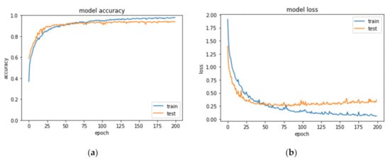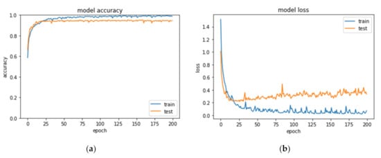 The progress of CNNs in the image recognition field has been remarkable. For performance comparison, we first conducted popular CNN architectures Le-net5 using the database, which resulted in the model’s evaluating accuracy of 93.71%. The model accuracy and loss curve of training and testing as Figure 6 shows. It can be found that the training tends to be stable after approximately 25 epochs, but the model loss was slightly higher in the testing phase.