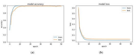 The success of our MalCaps model was compared to that of CNN for the discrimination of malware based on the hyper-parameters optimized Le-net5. The MalCaps model was iterated over 50 epochs, Figure 8 shows training loss decreases over epoch iterations, whilst training accuracy increases, and resulting in an accuracy of 99.89%. These promising results suggest that this MalCaps can be used in malware classification. This final implementation achieved an overall precision of 99.34%, which was better than that of the hyper-parameter optimized CNN model in the previous experiment.