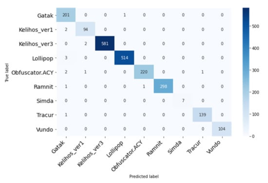 Confusion matrix of our MalCaps classification results.