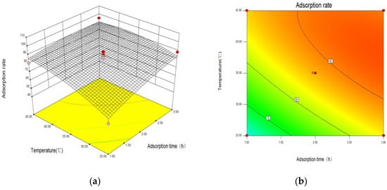 According to the principle of the Box–Behnken response surface optimisation [], the experimental study was established to remove Sb(III) by FMPAs in low (−1), middle (0), high (1) levels, respectively. Adsorption time, dosing quantity, pH, temperature, and Sb(III) initial concentration were used as independent variables, with Sb(III) removal efficiency as the response value to look at the independent variable response and define the values for the main factors and their interaction. The horizontal coding and test values of independent variables were shown in Table 1. There are forty-six groups of optimization tests (Table 2), among which six groups of central point tests were designed to be repeated, and each group of tests were repeated three times.