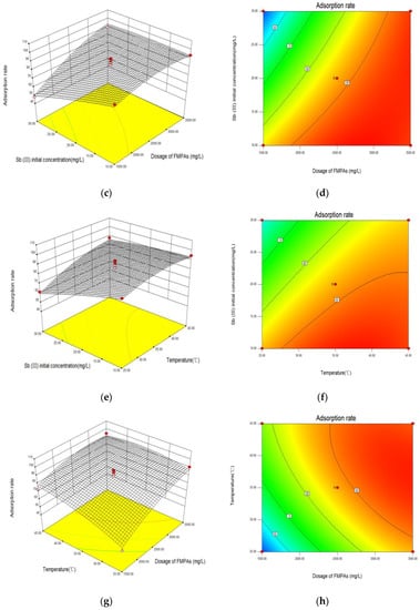 The 3D surface and contour. (a,b): Sb(III) Temperature, Adsorption time and Adsorption rate, (c,d): Sb(III) Initial concentration, Dosage of FMPAs and Adsorption rate, (e,f): Sb(III) Initial concentration, Temperature and Adsorption rate, (g,h): Sb(III) Temperature, Dosage of FMPAs and adsorption rate.